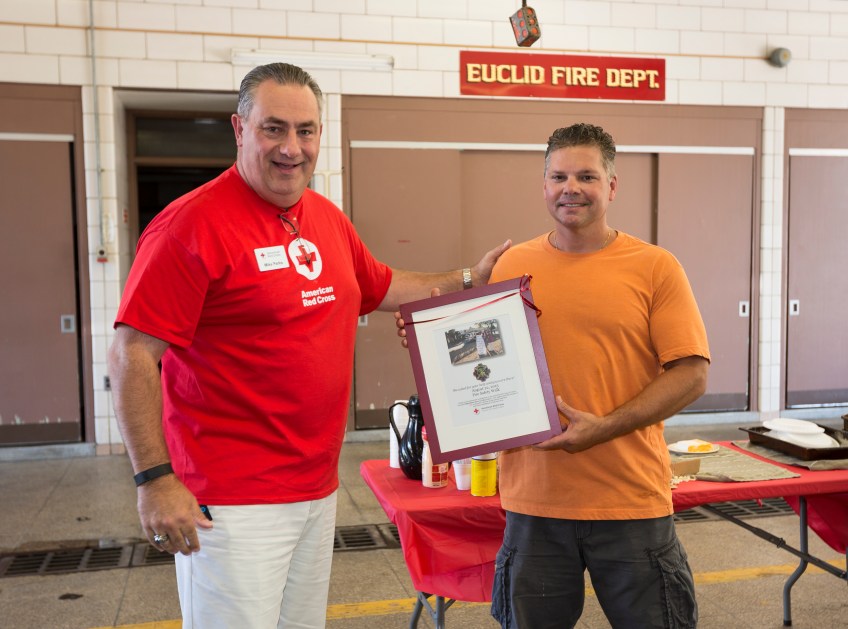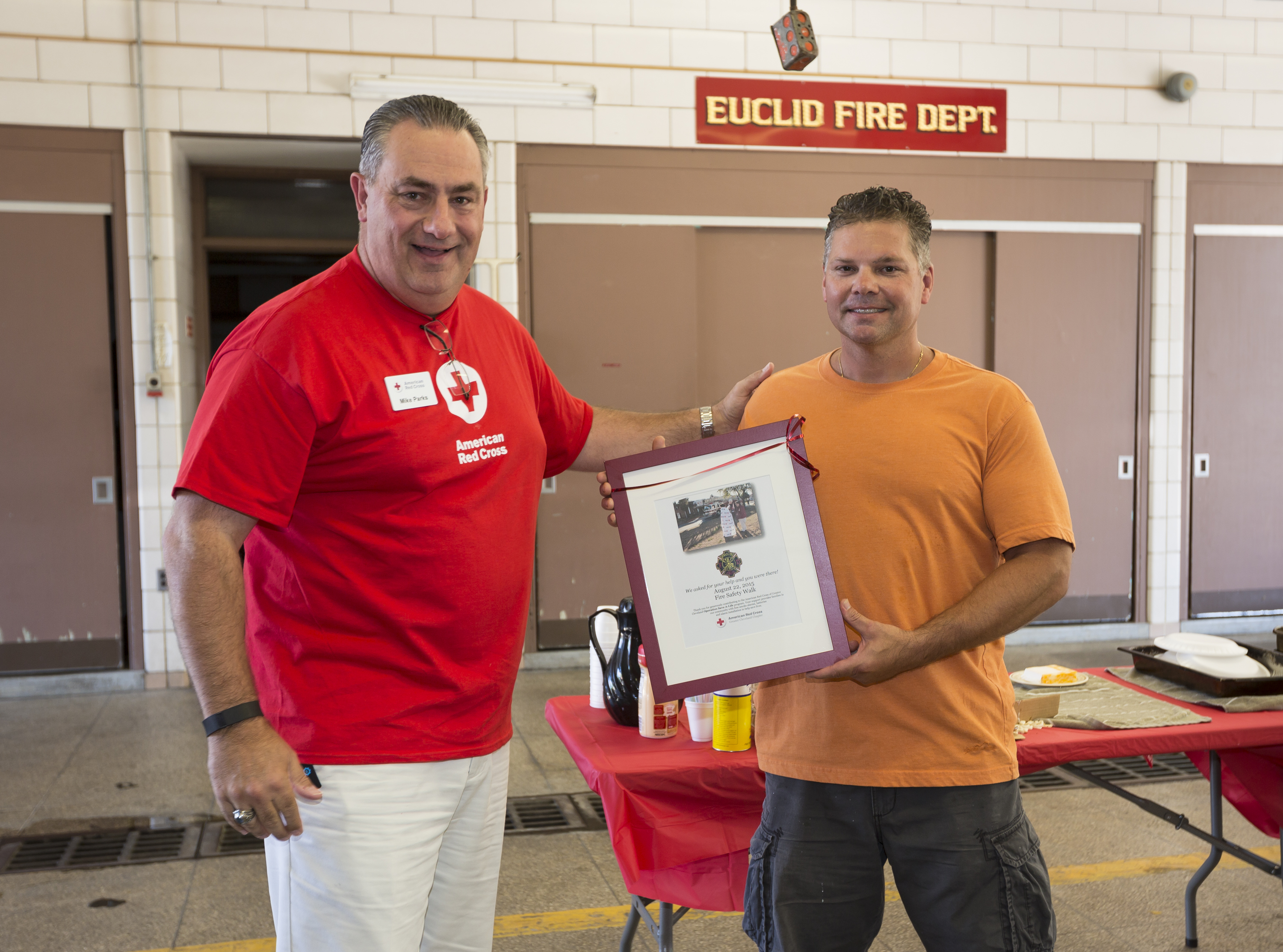 Fire Safety Walk-2851 Published August 24, 2015 at 3000 × 2226 in Operation Save-A-Life Volunteers Help Protect Euclid Residents From Home Fires Mike Parks (Northeast Ohio Regional CEO) with Chris Haddock (Euclid Fire Department Chief)