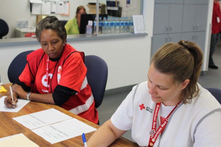 Post-disaster Registration Published October 8, 2015 at 5184 × 3456 in New Disaster Ops Chief Brings Wealth of Experience To Region Red Cross volunteers at the registration desk