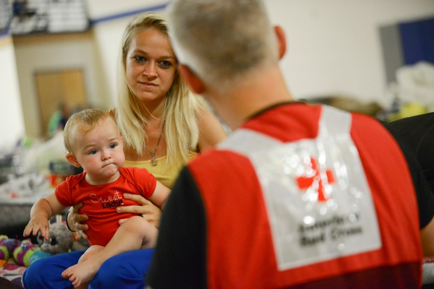 Heather Shafer and her one-year-old daughter Sarah lives with her parents in East Clendenin. Their home was flooded and they now staying at the Capital High School gymnasium in Charleston which has been turned into a Red Cross shelter.