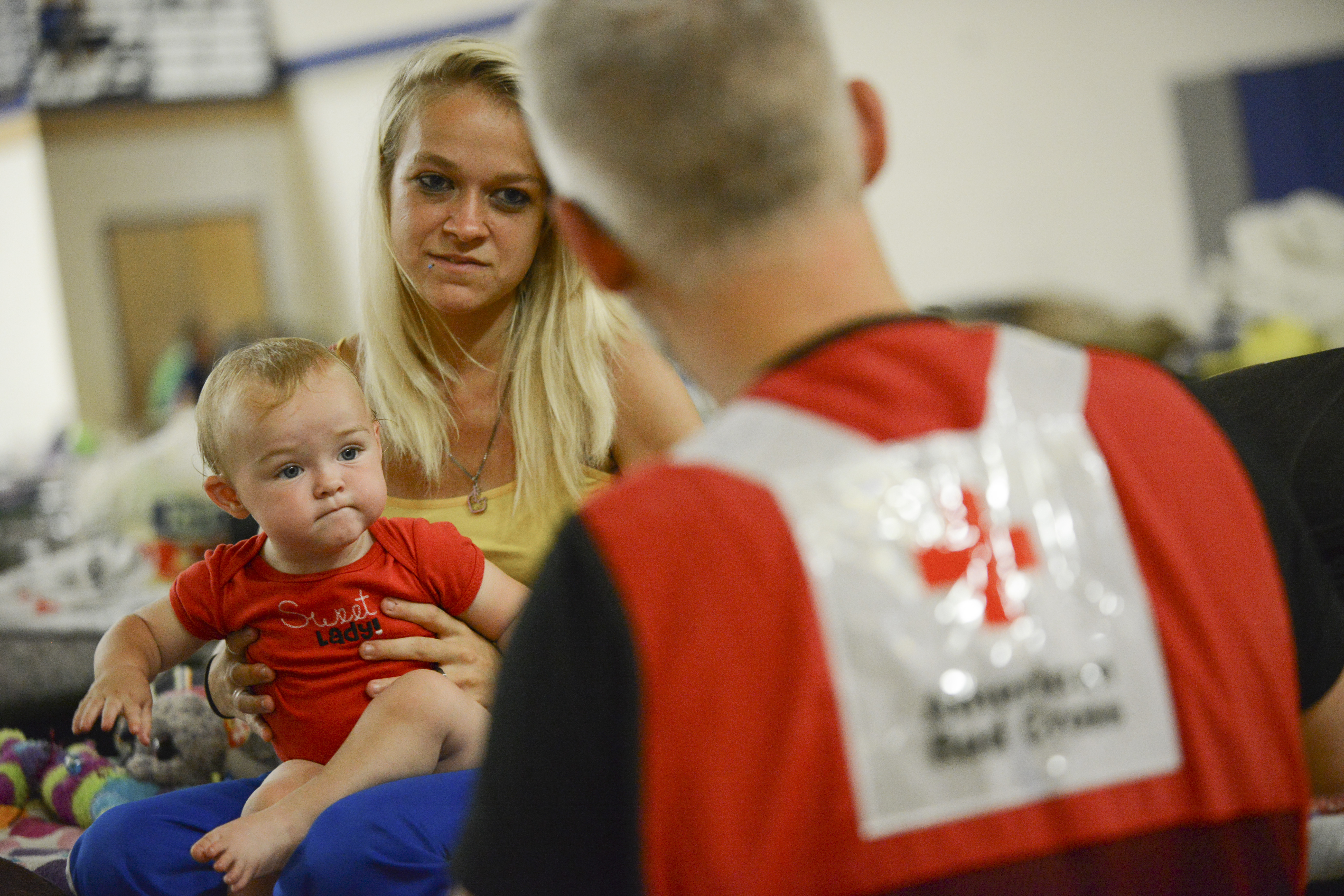 Heather Shafer and her one-year-old daughter Sarah lives with her parents in East Clendenin. Their home was flooded and they now staying at the Capital High School gymnasium in Charleston which has been turned into a Red Cross shelter.