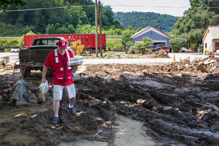 June 30, 2016. Birch River, West Virginia. American Red Cross worker Kevin Beale delivers containers of pulled pork to a Birch River, West Virginia, resident. The emergency response vehicle traveled through neighborhoods, delivering nearly 150 hot meals to the community. Photo by Marko Kokic for the American Red Cross