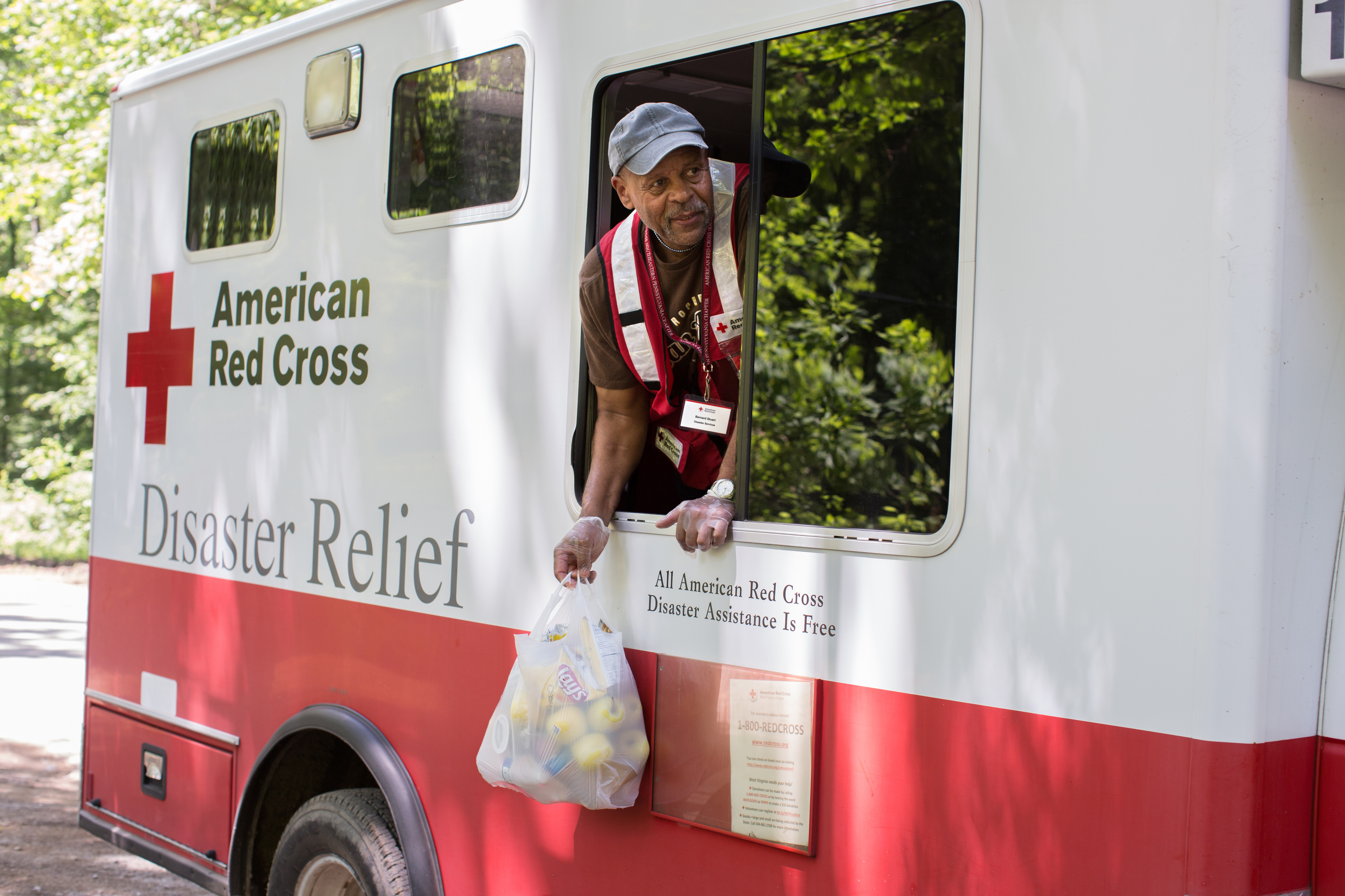 June 30, 2016. Birch River, West Virginia. American Red Cross worker Bernard Stuart holds a bag of snacks and water for a resident in Birch River, West Virginia. The emergency response vehicle traveled through neighborhoods, delivering nearly 150 hot meals to the community. Photo by Marko Kokic for the American Red Cross