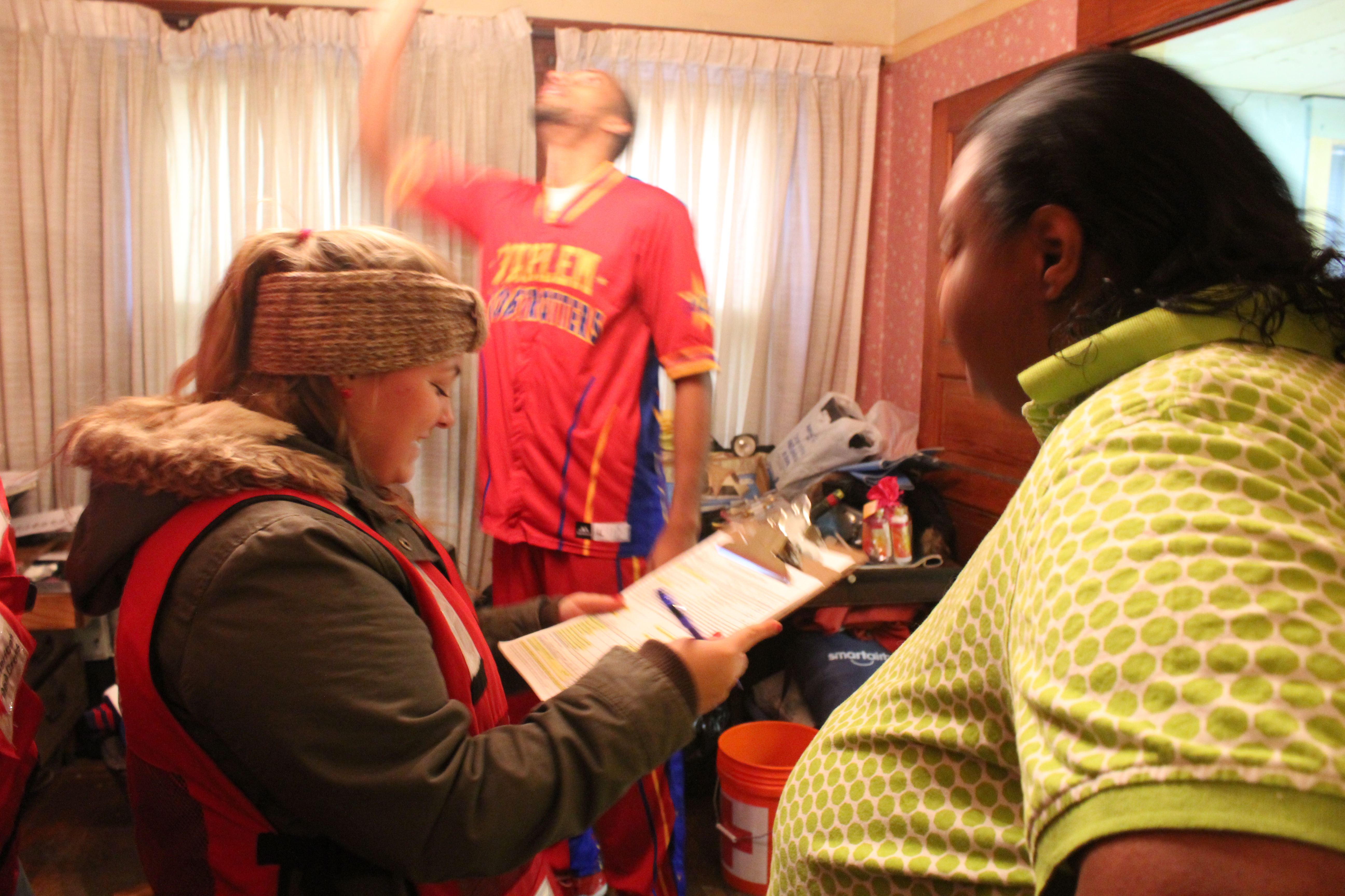 img_3211 Published December 15, 2016 at 5184 × 3456 in The Globetrotters and the Great Assist Disaster Program Specialist Emily Probst shares fire safety information with Cleveland resident Teressa Jackson, as Zeus McClurkin installs a smoke alarm