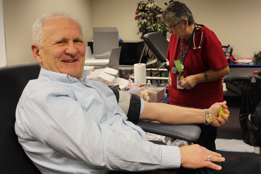 IMG_5207 Published January 16, 2018 at 3629 × 2419 in Firm Steps Up During Urgent Appeal for Blood Donations Jack Schron, President and CEO of Jergens Inc. donates his 83rd pint with the assistance of Red Cross Collections Specialist Phyllis Schoville