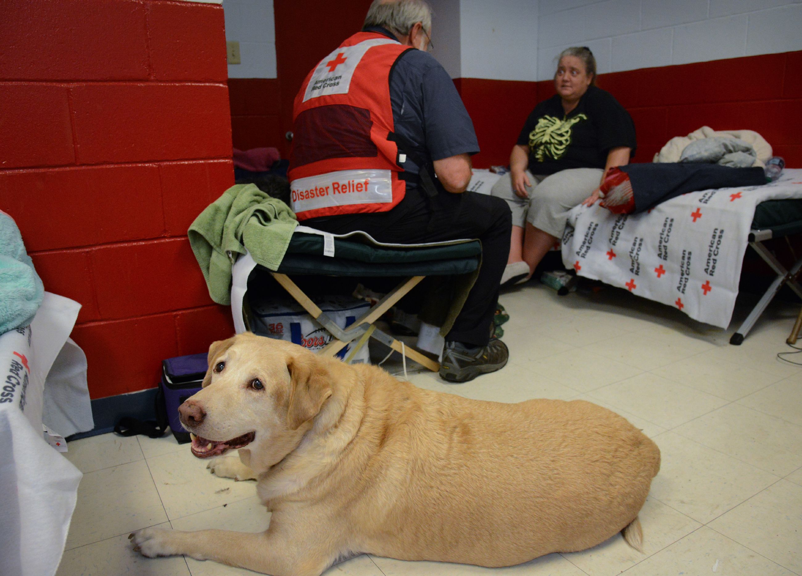 October 13, 2018, Red Cross Shelter, Bozeman High School, Panama City, Florida. Shelter resident Rochelle Browe shares her experience of living in a shelter along with her three service dogs and hundreds of other shelter residents with American Red Cross volunteer Bob Wallace. Rochelle, along with Wicked (not shown), Snow (white), and Lucky (blond), found refuge in the shelter from Hurricane Michael. I was scared, even in this shelter with its concrete block walls. You could hear the trees coming down all around. Rochelle went on to describe how during the hurricane Red Cross workers were calmly walking around, talking to the shelter residents. We are with you, was the message she said they conveyed.