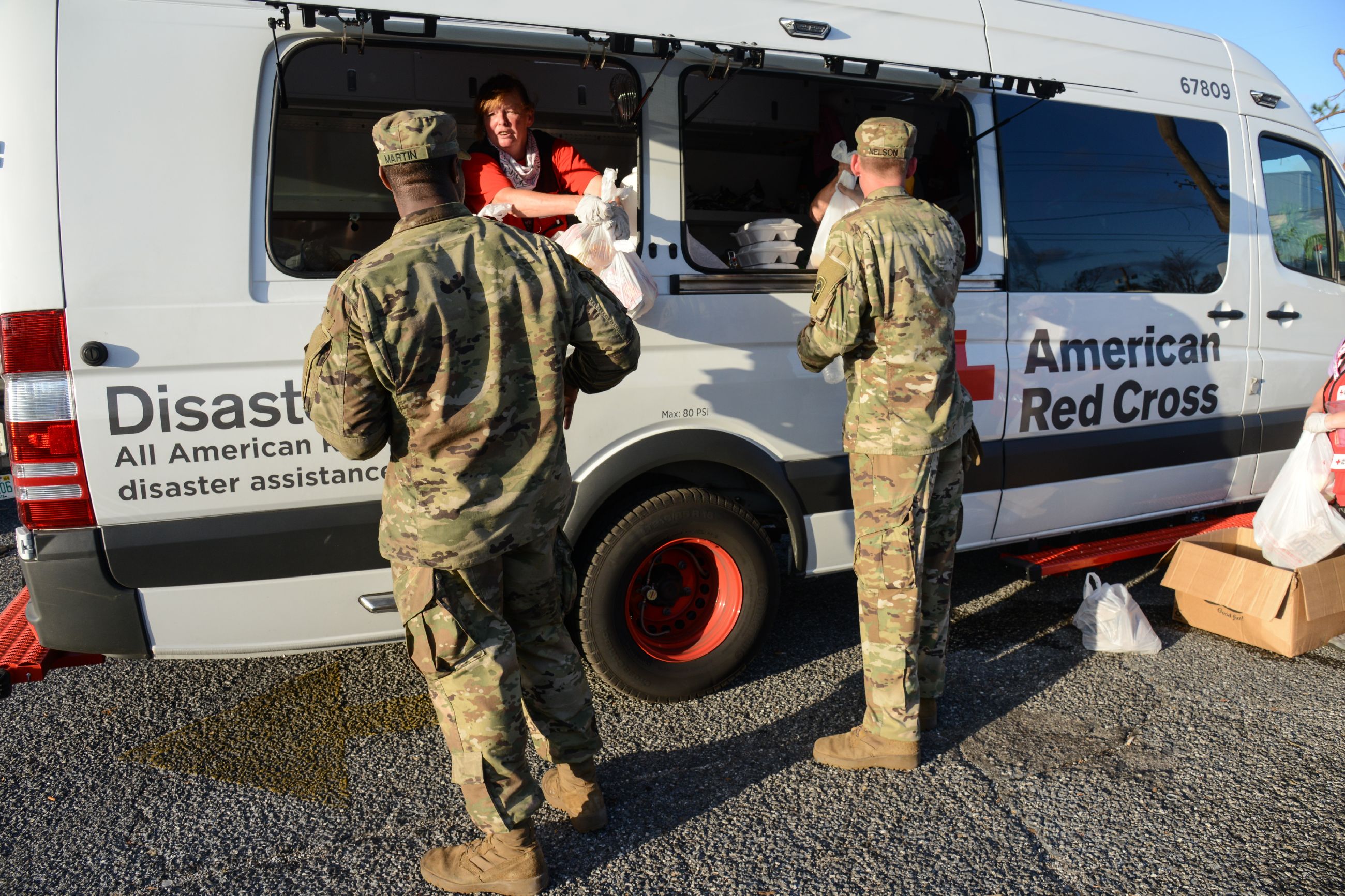 October 16, 2018, The Cove Neighborhood, Panama City, Florida. Warren Martin and John Nelson, members of the Florida National Guard, stopped by the American Red Cross feeding vehicle to ask about the services the Red Cross was offering people impacted by Hurricane Michael and ended up taking a stack of hamburger dinners along with snacks for themselves and colleagues.