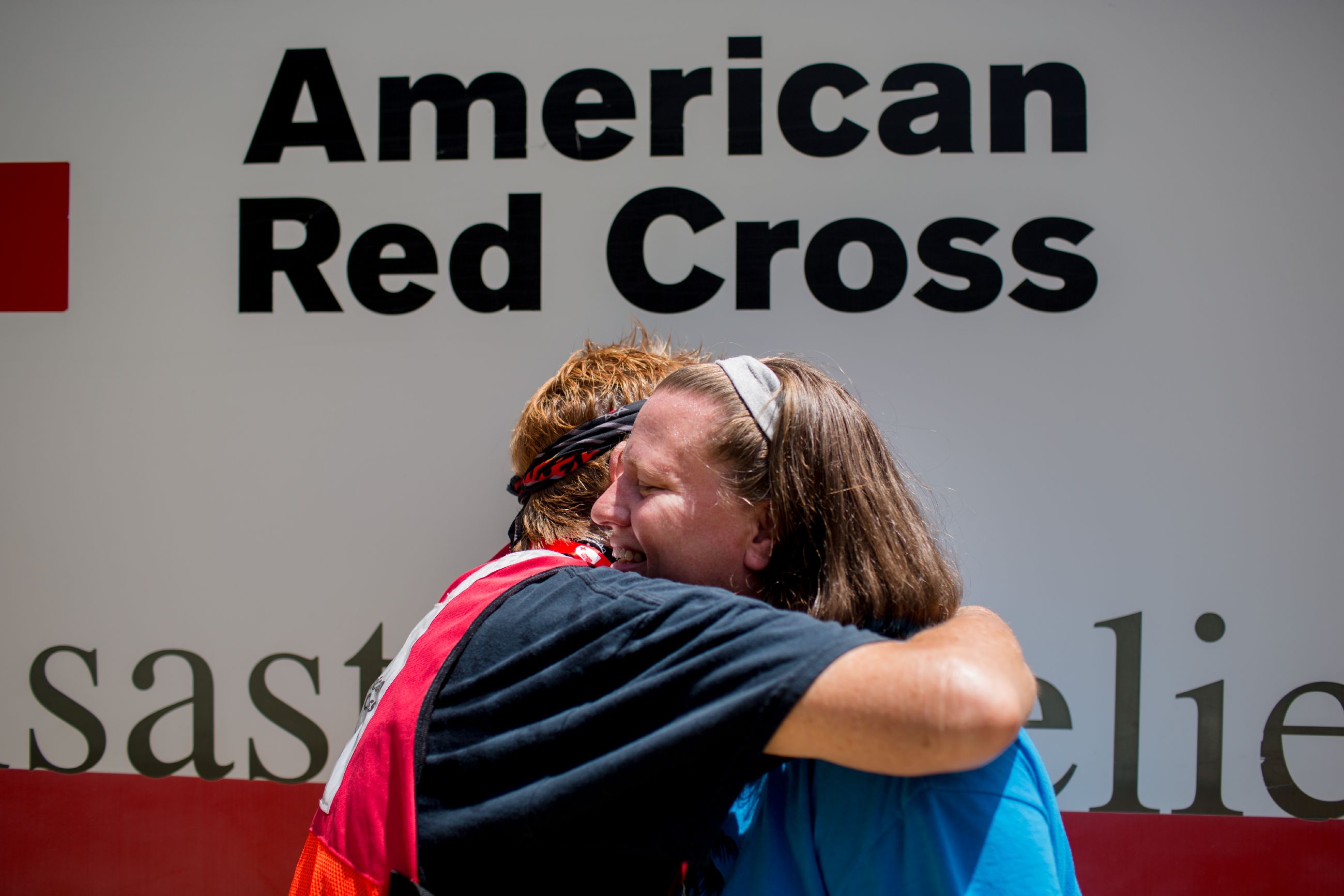 During a hot meal distribution in southern Louisiana, Red Cross volunteer Cora Lee, a local relief worker from Baton Rouge, hugs her daughter Shannon Lee, whose home was flooded in Denham Springs.