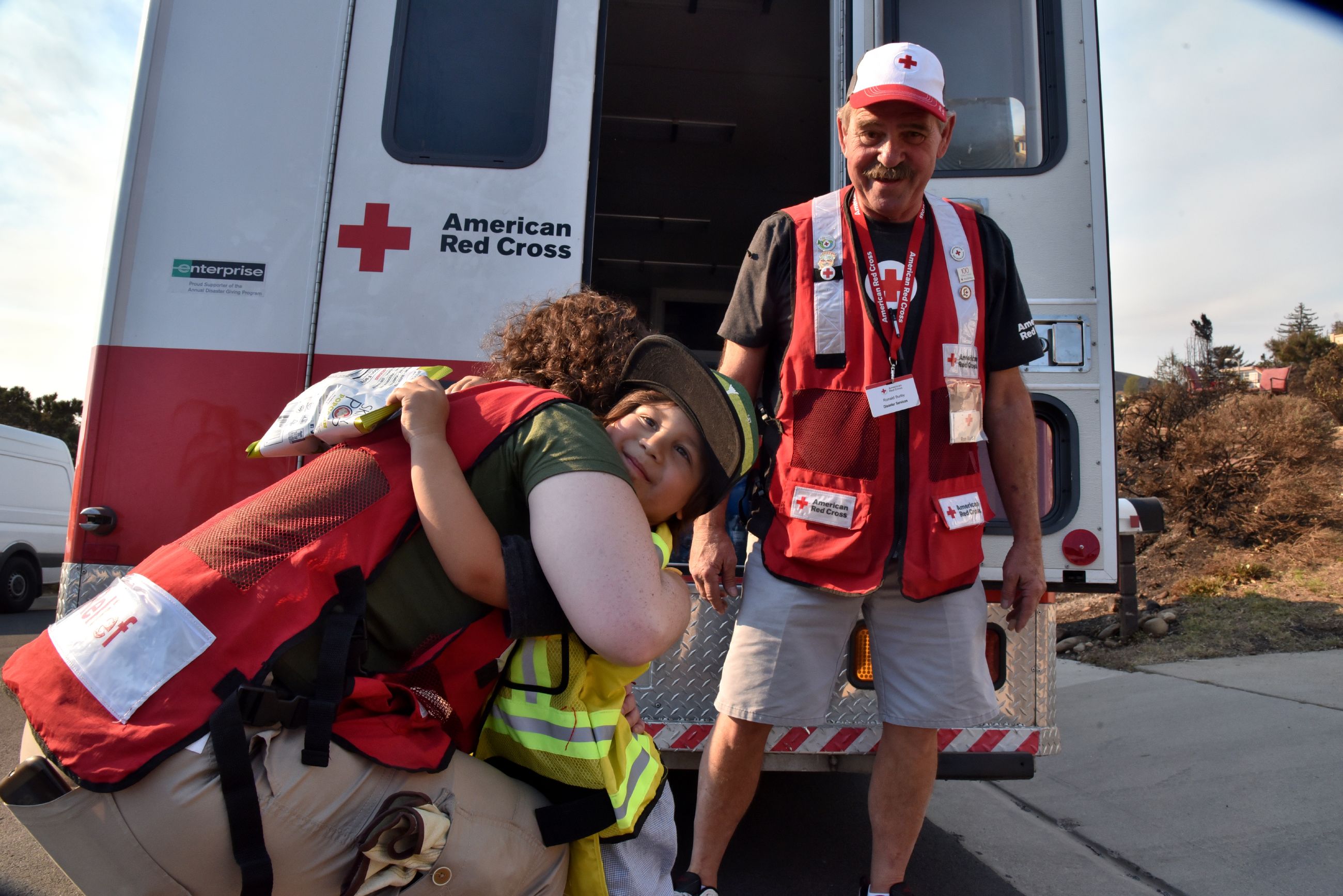 *Garretts son, Session (3), saw and can describe what the Thomas fire looked like as the family evacuated. It was a big fire, he said. Now Session is a big fan of firetrucks I got to push all the buttons and other emergency vehicles. He was thrilled to get a turn handing out snacks from the ERV, and got to announce his name to the neighborhood over the loud speaker. Volunteer Ron Burby gave Session a Red Cross souvenir pin so Session gave everyone at the Red Cross a big hug!