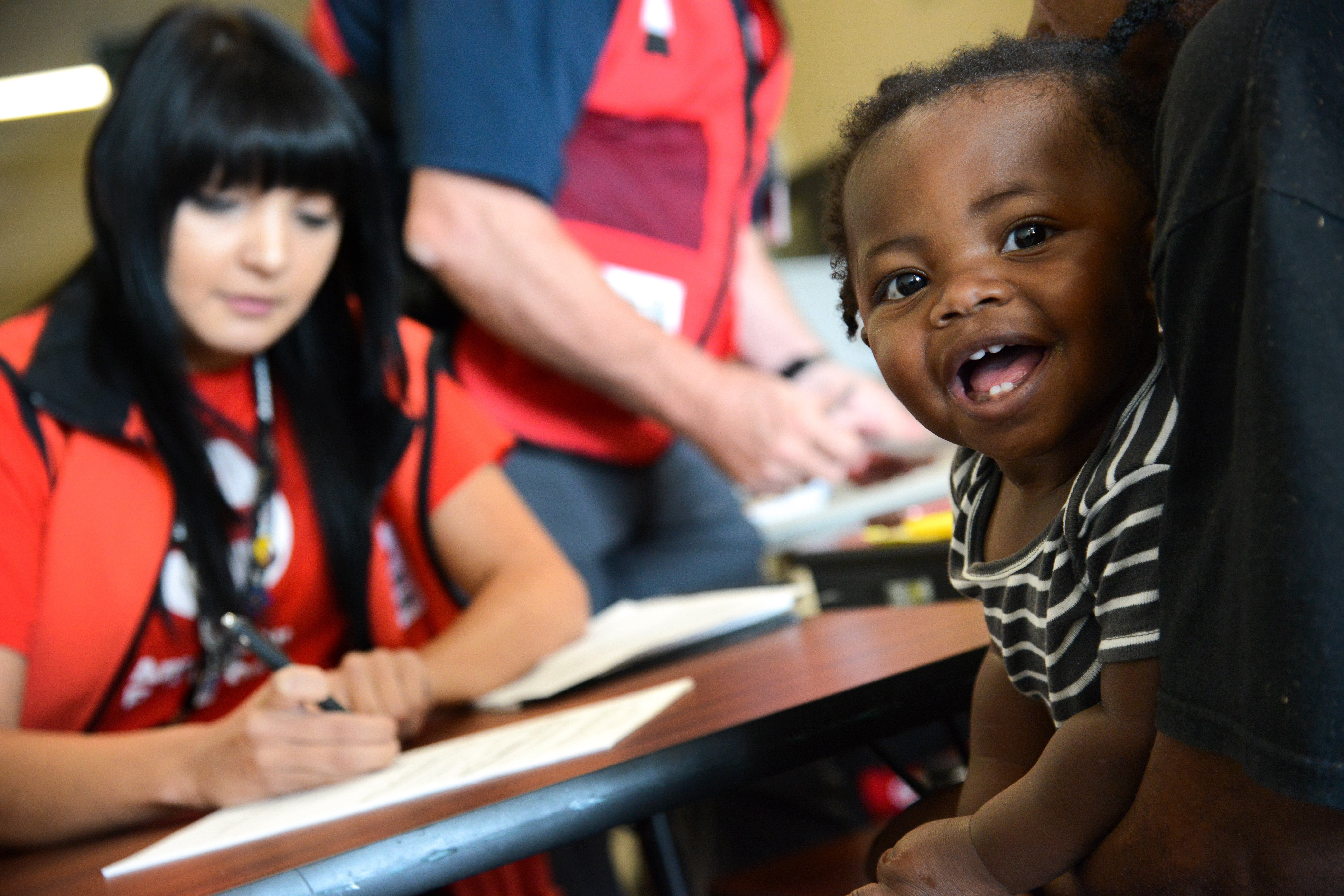 American Red Cross evacuation center worker Brianna Jo Hrabina welcomes and registers a new resident at the evacuation center located at Evans High School, while the resident’s 1-year-old Keelen smiles.