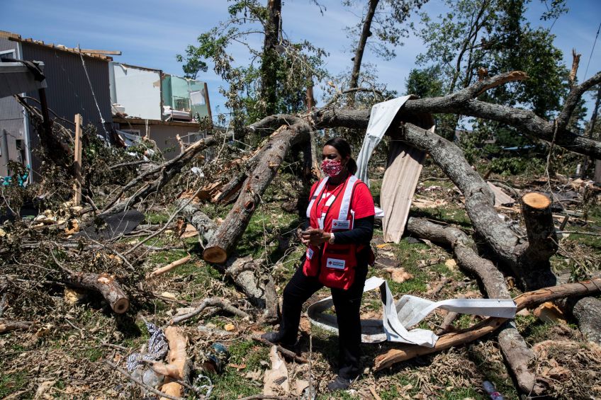 Liesa Hackett of The American Red Cross does damage assessment in Onalaska, TX, on Sunday, April 26, 2020. A powerful tornado damaged hundreds of homes in the community earlier in the week.
