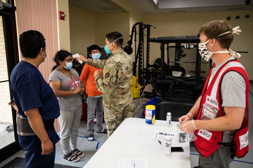 The Cantus family get their temperatures checked as part of a COVID-19 screening precaution before entering a Red Cross emergency shelter for people displaced by Hurricane Hanna in Edcouch, TX on Tuesday July 28, 2020.