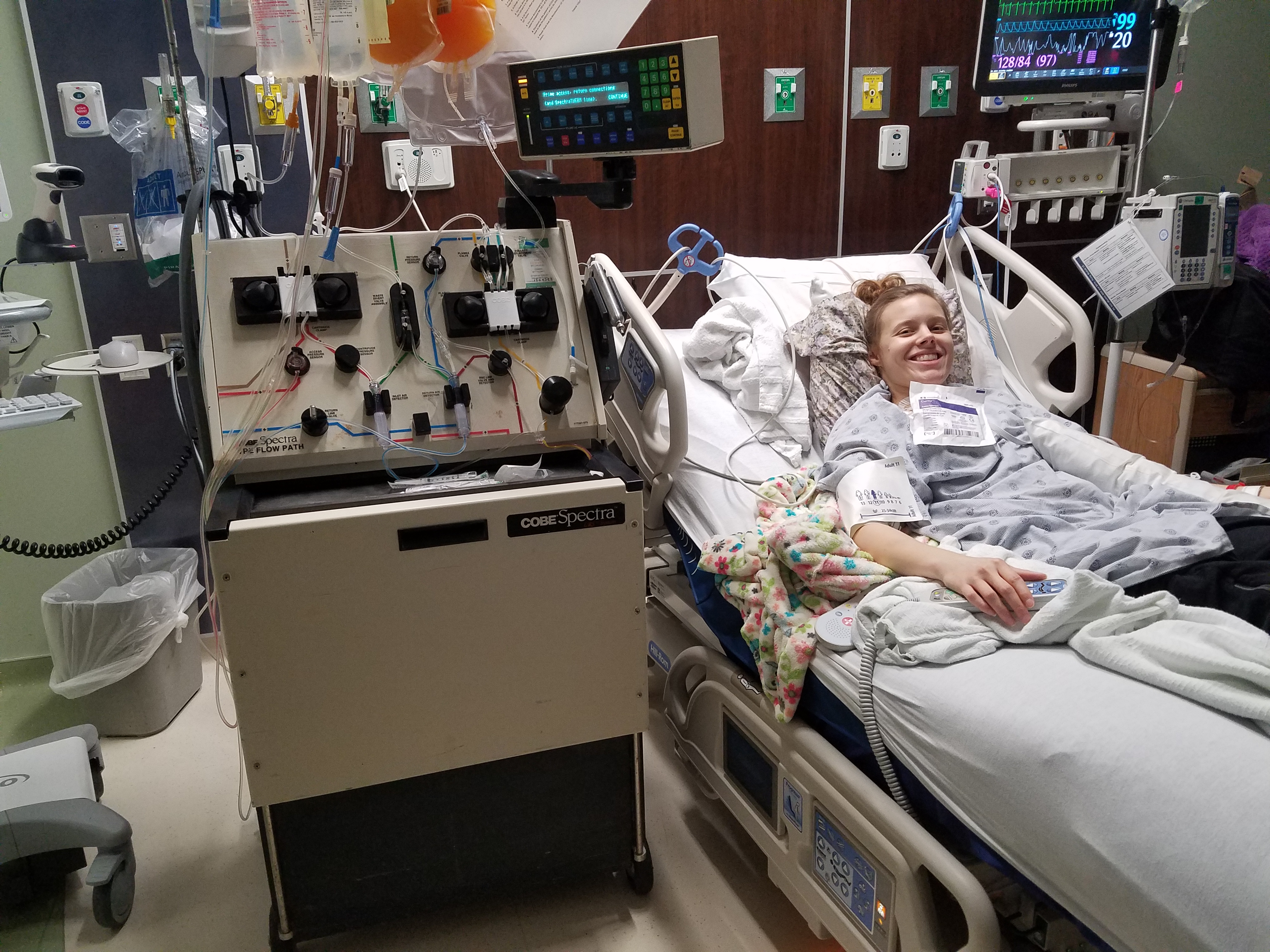 “This started me on a roller coaster of a 12-day hospital stay, a central dialysis line in my neck, and multiple units of red blood cells and plasma.” Kristin received 330 units of plasma, taking four hours each for 10 of those 12 days.