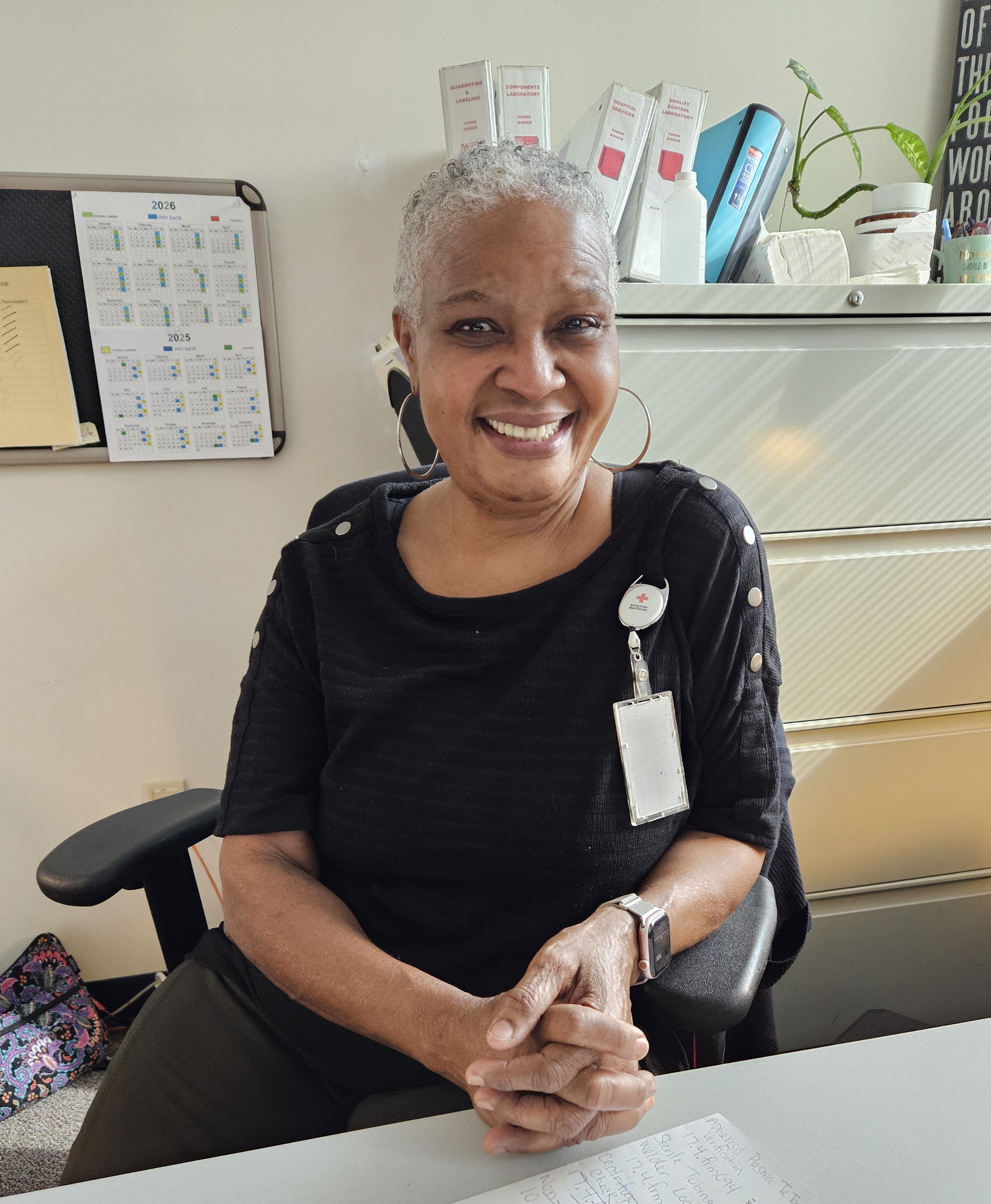 That department is called Manufacturing, which manufactures the blood products that are collected through donations. It has changed names over the course of her career, from Technical Services to Laboratory, and finally to Manufacturing.