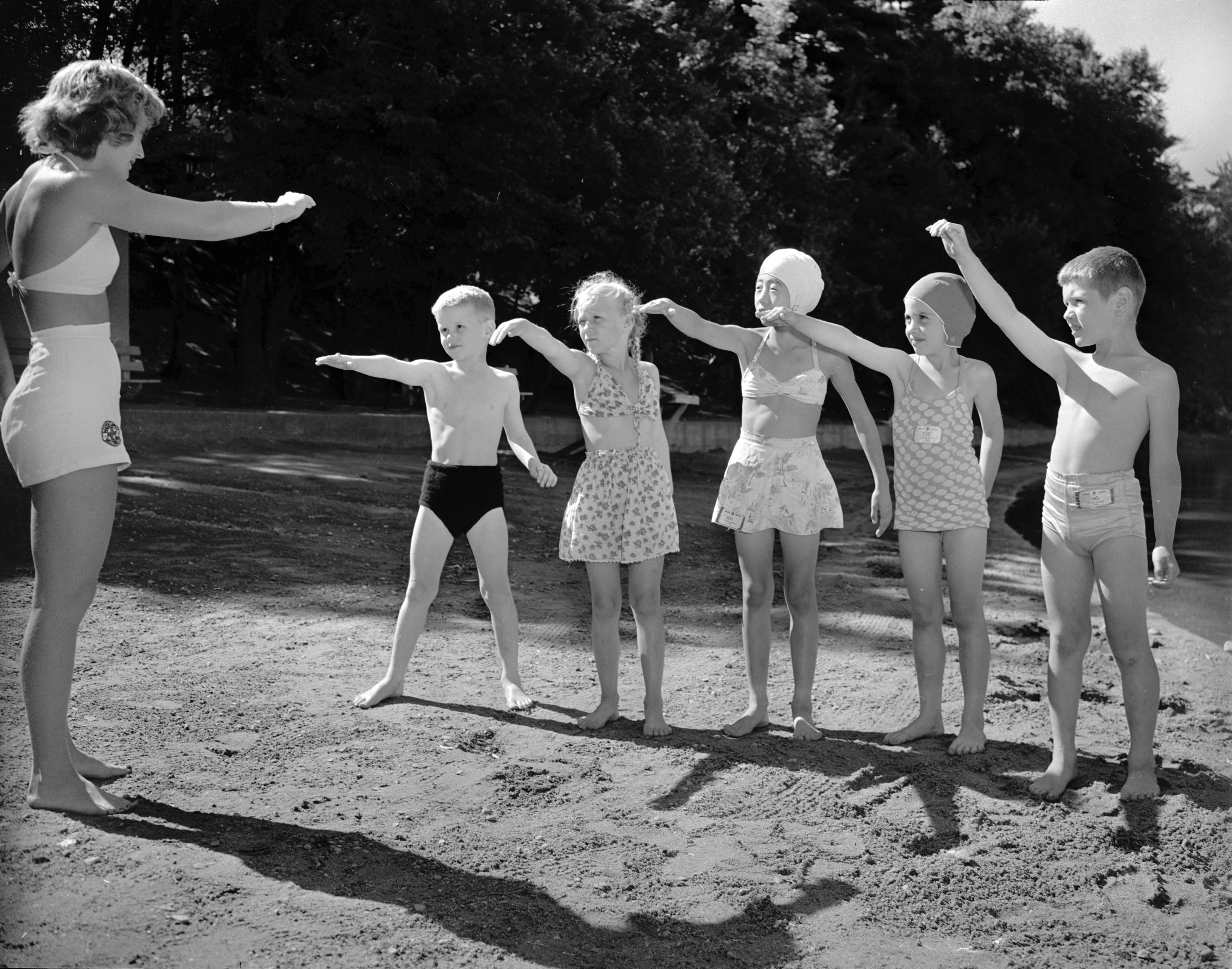 Historical Water Safety Published May 21, 2015 at 5552 × 4366 in Historical Water Safety A Red Cross volunteer Water Safety Instructor teaching youngsters in her community how to swim is conducting a land drill on arm movement for human stroke. American Red Cross photo.
