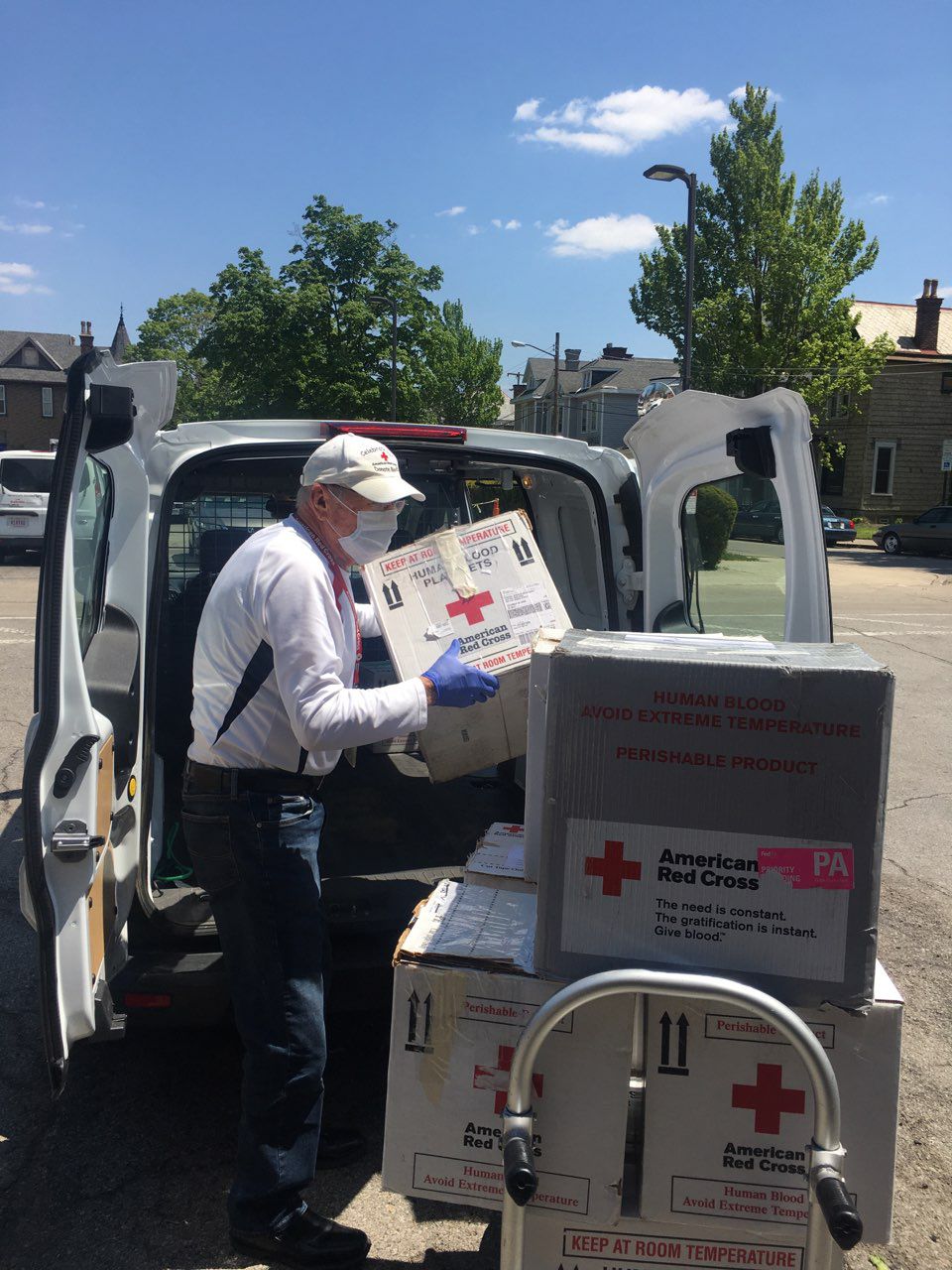 Hospital Services Volunteers with PPE 2020 Published September 21, 2020 at 960 × 1280 in Hospital Services Volunteers with PPE 2020 May 19, 2020. Columbus, Ohio. Clyde Welch, Red Cross volunteer driver, loads blood platelets and other blood products into a Red Cross van for delivery to patients in need at hospitals. Photo by Craig Miller/American Red Cross