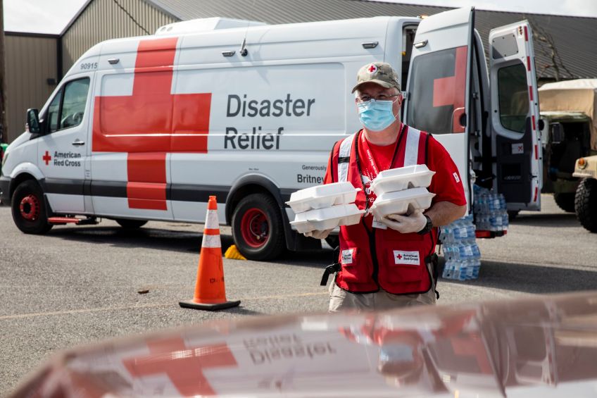 Brian McDaniel of the American Red Cross takes meals to be delivered at a drive-thru distribution point for families affected by Hurricane Laura in Sulphur, LA on Monday, August 31, 2020.