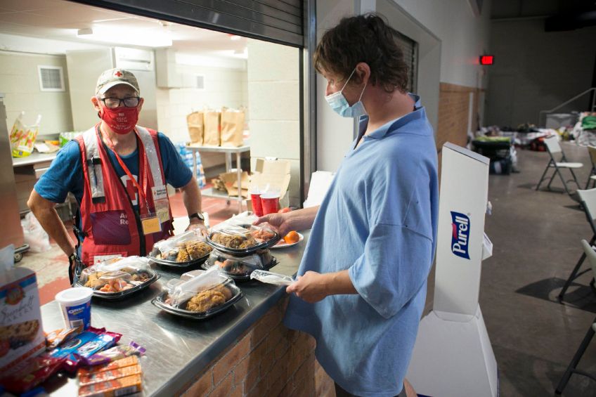 Iowa Storm Derecho 2020 Published August 19, 2020 at 2600 × 1733 in Iowa Storm Derecho 2020 August 17, 2020. Veterans Memorial Colosseum Red Cross operated shelter. Cedar Rapids, Iowa. Fried chicken and vegetables is the ultimate comfort meal, served to shelter client Brian by volunteer Robert. Photo by Dennis Drenner/American Red Cross