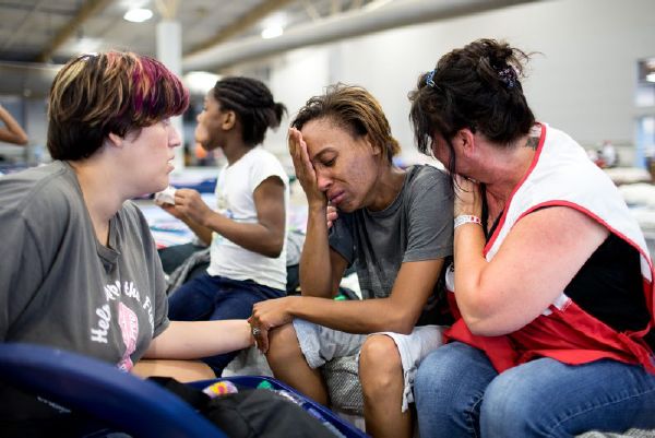 Courtney Robinson (center) says she is nearly certain that her home is destroyed because of the record flooding in southern Louisiana. She is staying at a Red Cross shelter with her children and husband. They fled with some essential items, such as food, water, and a change of clothes for them and their five children. Courtney shared their story with Red Cross relief worker Elizabeth Stander, and Rachel Ambeau, who is also displaced and staying at the Red Cross shelter, in Gonzales, Louisiana.