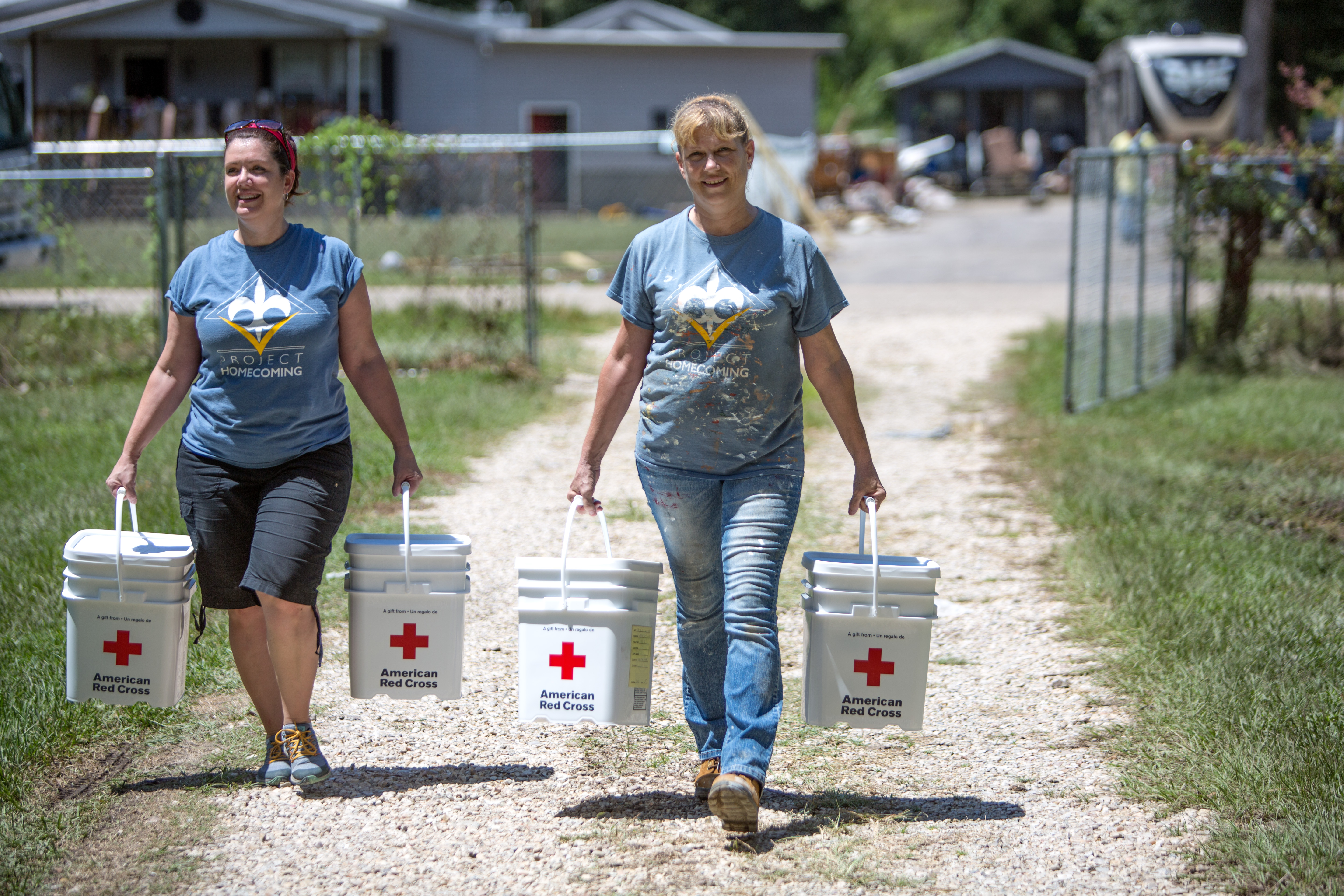 Project Homecoming relief workers Karin Peri-Ramos (l) and Christina Drake (r) deliver Red Cross clean-up kits to families beginning to recover from the flooding in southern Louisiana
