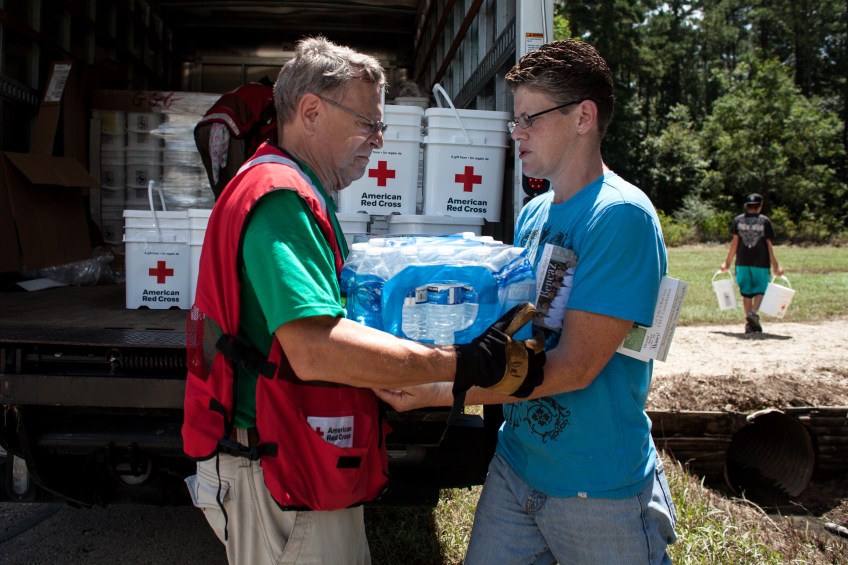 Louisiana Floods 2016 Published August 22, 2016 at 4776 × 3184 in Louisiana Floods 2016 August 19, 2016. Denham Springs, Louisiana. Del Ruiseco gives Red Cross relief supplies, including clean-up kits and water, to Melanie Taylor. Photo by: Marko Kokic/American Red Cross