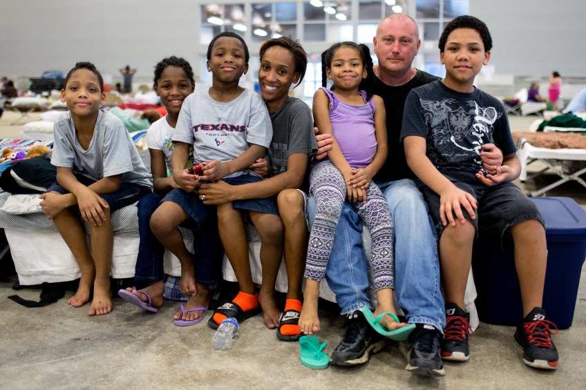 Courtney Robinson (center) says she is nearly certain that her home is destroyed because of the record flooding in southern Louisiana. Shes staying at a Red Cross shelter with her children and husband, Jeff Harper. In advance of the flood, they fled with some essential items, such as food, water, and a change of clothes for them and their five children.