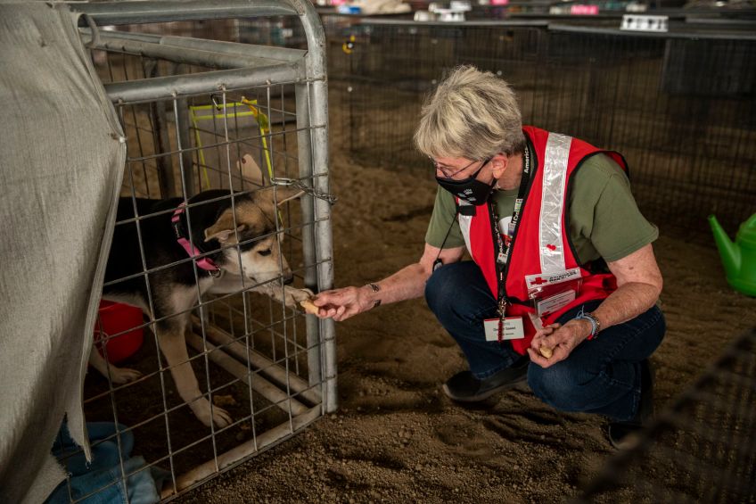 Oregon wildfires have displaced people and animals. American Red Cross volunteer Gaenor Speed enjoys spending a moment with a dog that is currently being cared for at the Jackson County Expo and Fairgrounds, in Central Point, OR on Sunday, September 13, 2020. The Red Cross works with partners to provide care for animals and pets. As a shelter worker, Gaenor provides care for the people housed at the Expo Center in the Fairgrounds complex.