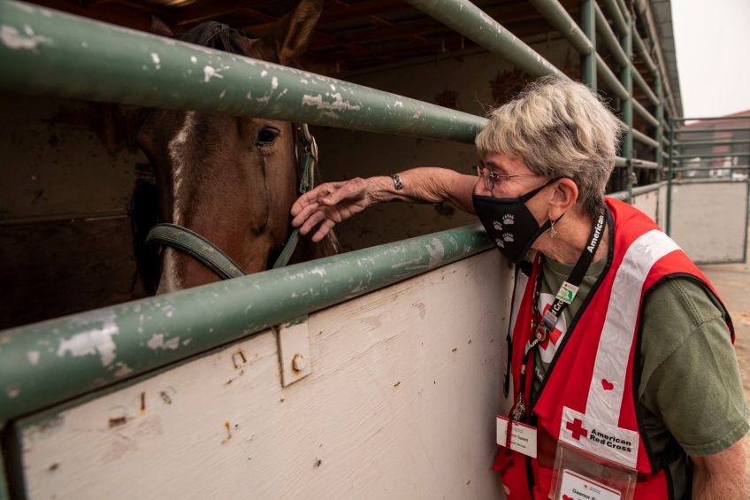 Oregon wildfires have displaced people and animals. American Red Cross volunteer Gaenor Speed looks in on a horse that is currently being cared for at the Jackson County Expo and Fairgrounds, in Central Point, OR on Sunday, September 13, 2020. The Red Cross works with partners to provide care for animals and pets.