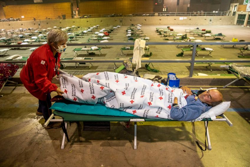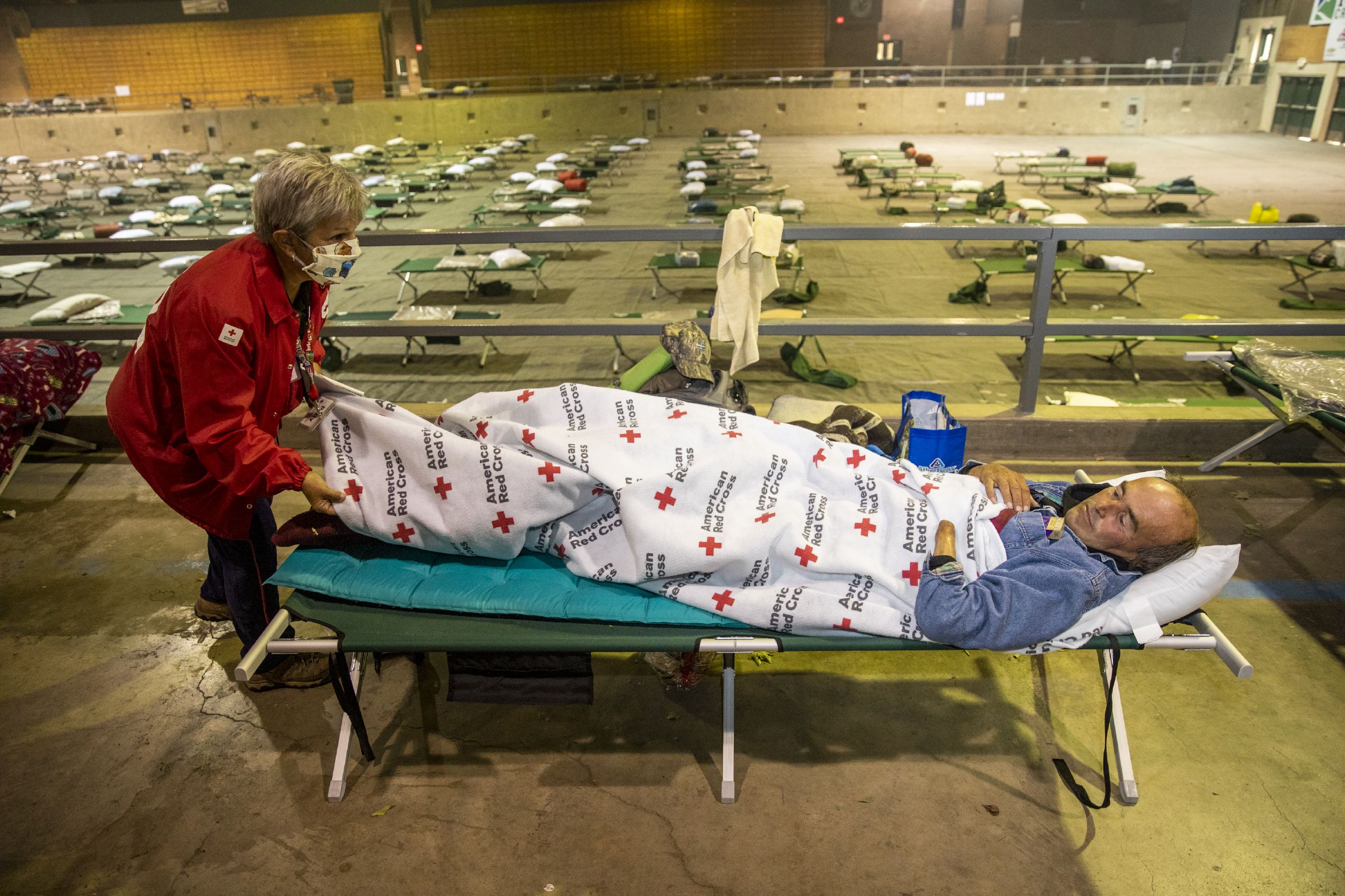 Patty Albin of the American Red Cross checks on Travis Wagner as he rests at the Jackson County Expo and Fairgrounds shelter after fleeing the wildfires in Central Point, OR on Sunday, September 13, 2020.