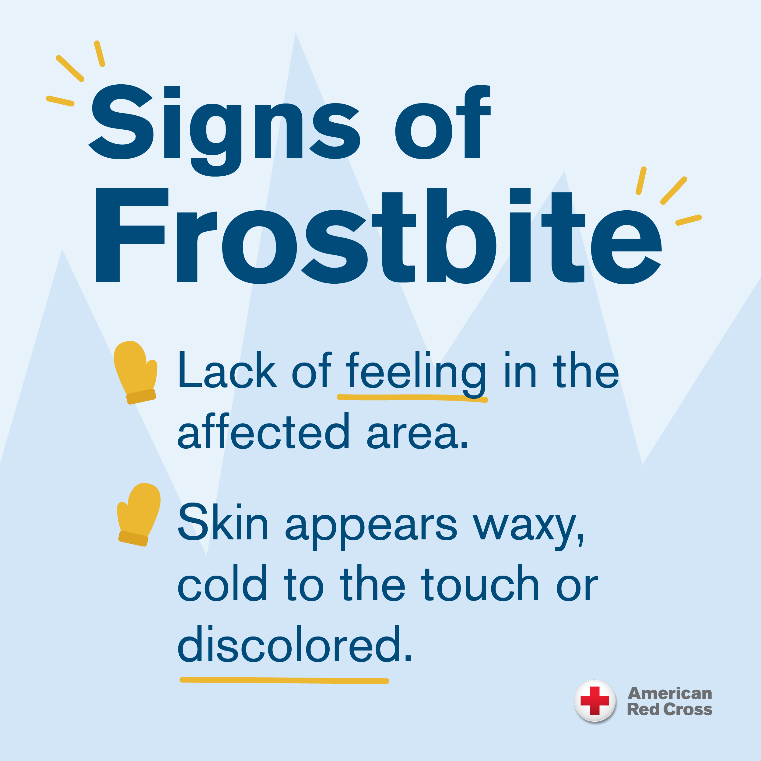 - Watch for signs of hypothermia and frostbite.