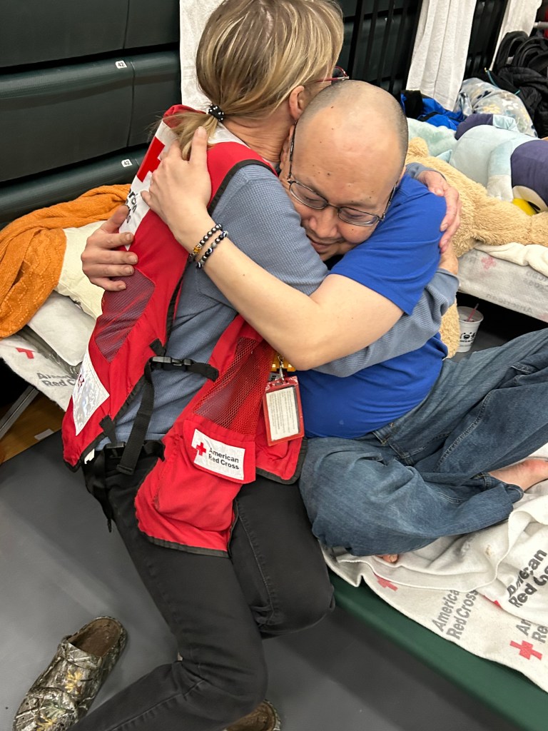 Red Cross volunteer Deb Blaze hugging Gilbert Amik, resident of the village of Kipnuk in Western Alaska, who was evacuated, along with his mother, in the wake of Typhoon Halong. Photo by Ryan Lang/American Red Cross