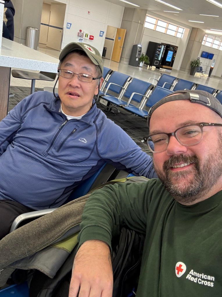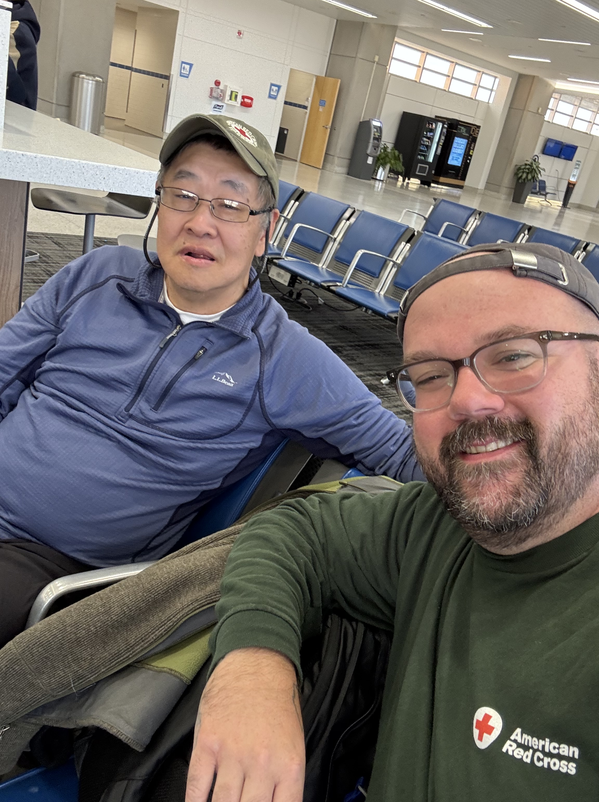 Randy Liang (left) and Ryan Lang at Akron-Canton Airport, waiting to take off to Alaska in response to Typhoon Halong that hit the western coast of Alaska in October 2025.