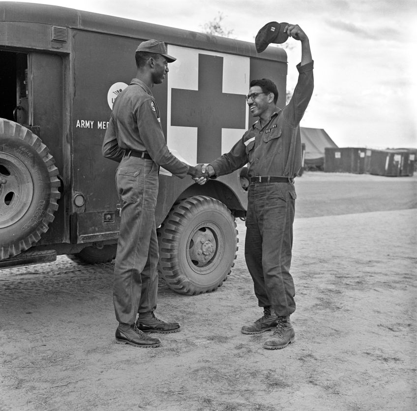 1966. South Vietnam. Good news from home does a lot to boost the morale of a serviceman stationed in Vietnam. Captain John H. Orozco, of Tucson, Arizona, waves his hat when the Red Cross notifies him of the birth of a new son. Red Cross assistant field director Morris J. Atkinson, an Oklahoman from Spencer, delivers the message.